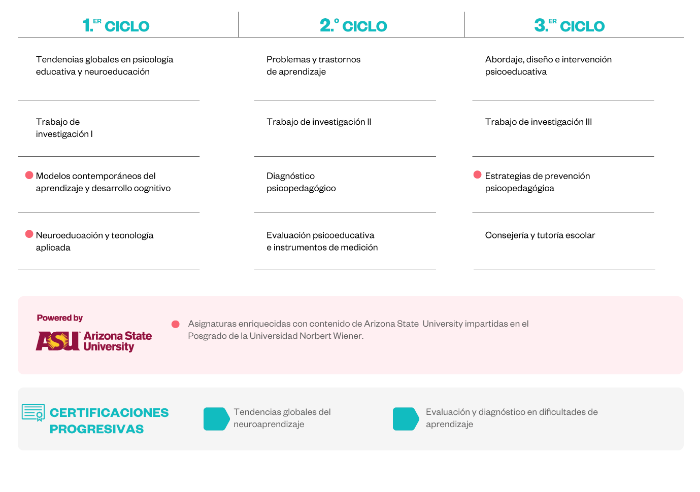 Prepara especialistas capaces de aplicar la neurociencia en el diagnóstico, la intervención psicopedagógica y la mejora del aprendizaje, con enfoque inclusivo y basado en evidencia. Su malla curricular especializada desarrolla competencias en cinco ejes fundamentales: evaluación, intervención, diseño de programas, prevención psicoeducativa, neuroeducación e investigación. Además, el programa incorpora certificaciones progresivas, cursos con Arizona State University (ASU) y una misión académica internacional que fortalece la visión global e innovadora del estudiante.